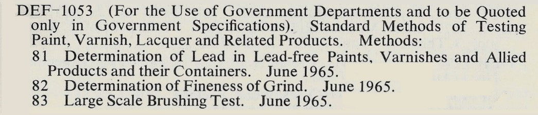 The tests in DEF-1053 were updated annually in 1957-66. In 1961 a standard was introduced for alkyd vehicle paint, amended 1963, 1966 and reprinted in 1972