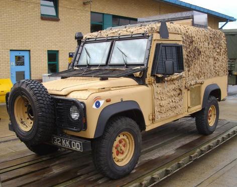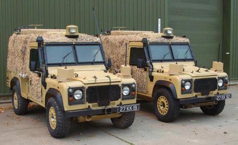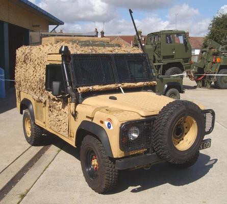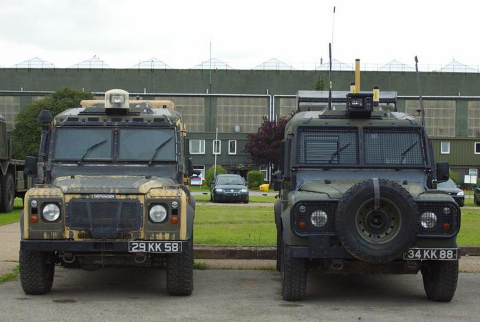 29KK58 and 34KK88, seen on 13th September 2009, at the Defence School of Transport, Leconfield. 29KK58 has a snorkel, plastic cover over the search light, no headlight surrounds, metal radiator grill, air con grill in side locker, alloy wheels (and run flat tyres?), 'washed off' sand paint, no loose scrim, no bull bar, no wire cutter, no window armour. 34KK88 has no snorkel, metal cage over on search light, TD5 headlight surrounds, plastic radiator cover, bull bar and spare wheel, ECM antennas on roof, wire cutter, windscreen and side window grills, steel wheels and green paint.